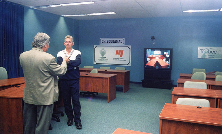 Salle de vidéoconférence à ChibougamauÀ la fin des années 1990, le patrimoine académique s’est enrichi et l’Université offre 32 certificats, 19 baccalauréats, 8 maîtrises et 3 doctorats. L’enseignement à distance se développe en direct, avec des classes reliées par tableaux électroniques et plus tard, par vidéoconférence et par l’offre de cours médiatisés sur vidéocassettes et sur DVD.