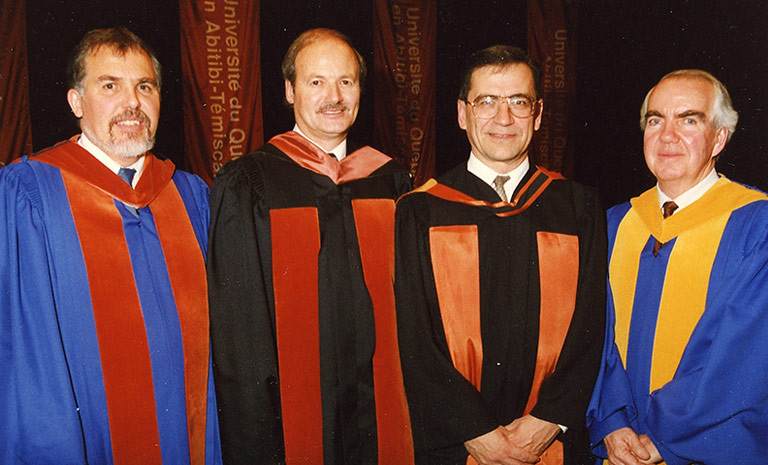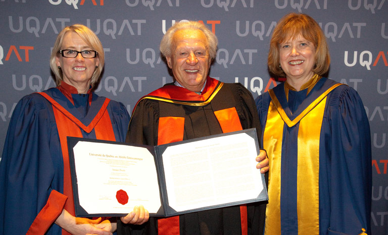 Jean Perron et Rémy TrudelL’UQAT remet son premier doctorat honorifique à M. Jean Perron pour souligner son apport au développement économique de l’Abitibi-Témiscamingue. Avec ses frères Normand et Michel, il a construit un conglomérat forestier dans la région de l’Abitibi-Ouest, incluant une usine de papier journal à Amos. Aussi, en 1990, les trois frères financent l’acquisition du premier ordinateur destiné à la recherche et depuis lors, les locaux informatiques sont désignés sous le nom de Centre de calcul des Frères-Perron. C’est en remettant la plus haute distinction à M. Perron que l’UQAT a voulu rendre hommage aux trois frères bâtisseurs, qui souhaitent toujours soutenir l’Université.